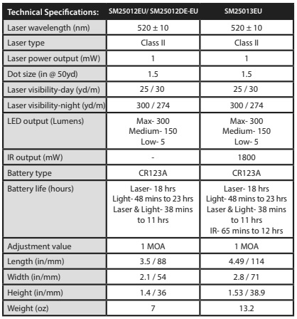 • Životnost baterie: Laser - 18 hod / Světlo - 48 min. až 23 hod / Laser a Světlo - 38 min. až 11 hod / IR (Infračervené) - 65 min. až 12 hod.