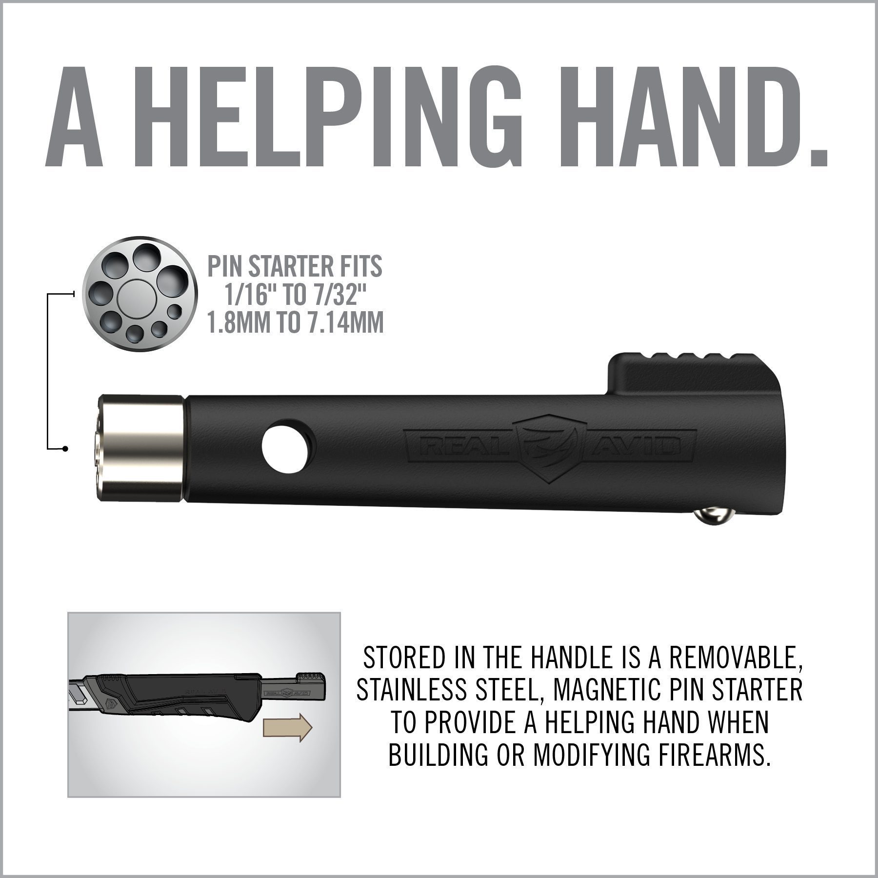 Sada obsahuje odnímatelný kryt pro měkké údery a vyměnitelné hlavy kladiva, které lze prakticky uložit přímo do integrovaného úložného prostoru. Díky tomu je snadné vždy zvolit tu správnou úderovou plochu pro daný úkol. V rukojeti je navíc uložen vyjímatelný magnetický nástavec pro startování čepů (pin starter) z nerezové oceli, který vám poslouží jako „pomocná ruka“ při stavbě nebo úpravách střelných zbraní.